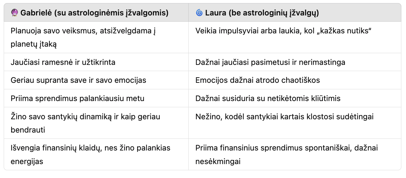 Astrologinė analizė suteikia įžvalgų apie finansus ir karjeros galimybes, meilę ir santykius, emocinę būseną ir vidinį balansą. Ji padeda priimti tinkamiausius sprendimus, išvengti nereikalingų konfliktų, aiškiau suprasti savo tikslus ir pasirinkti palankiausią laiką svarbiems veiksmams.